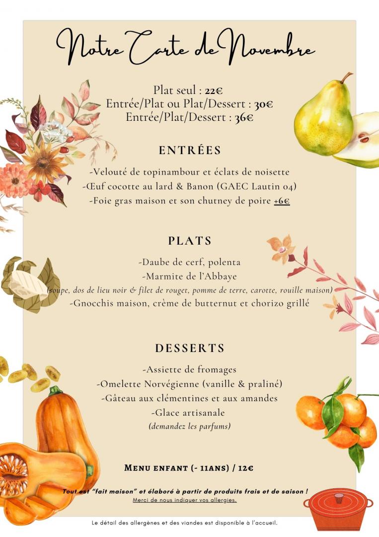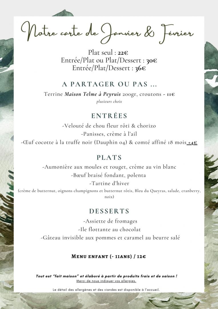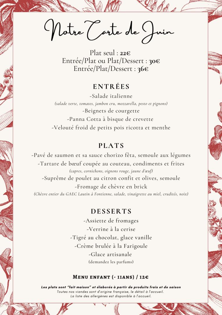 Vous retrouverez notre carte midi et soir qui varient au fil des mois et des saisons.